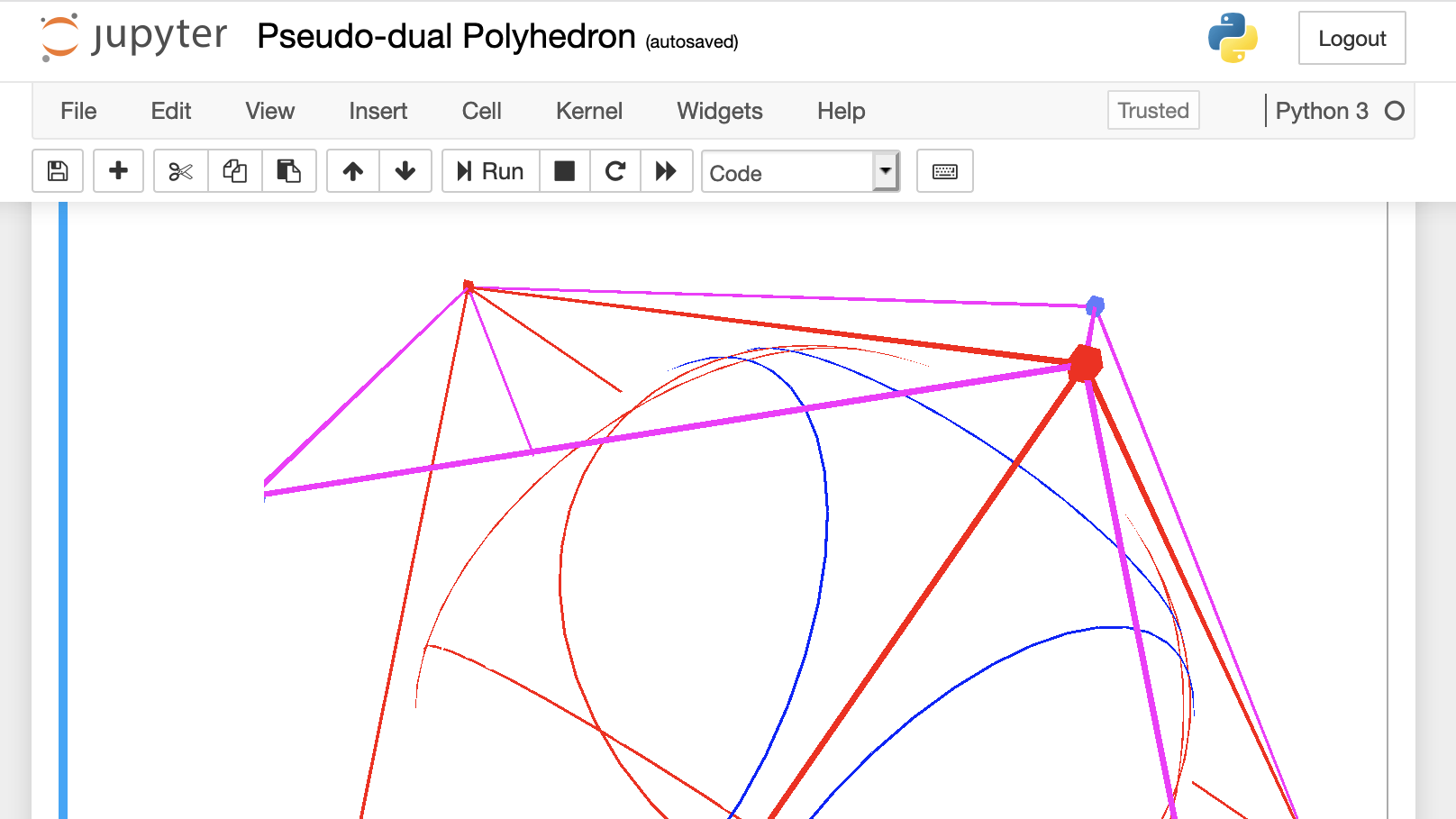 At the time of this writing, most of the example notebooks are poorly maintained / junk. It’s on my TODO list to clean them out. However, if you want to do a quick sanity check that everything appears to be working, from inside Jupyter open the “Example Notebooks/Pseudo-dual Polyhedron.ipynb”. When the notebook opens select Cell->Run All from the top menu. This should run all of the notebook’s cells generating at the end of the document a 3D viewer containing a polyhedron, a blank white sphere (p5js bug, the sphere used to be shaded–also on my TODO) and a circle pattern on the sphere (the circles are the tangent cone contacts for each of the vertices of the polyhedron). You should be able to click and drag to change the 3D view and use two finger scrolling on a track pad or a mouse wheel to zoom in/out (it is very sensitive). On my screen it looks something like this: